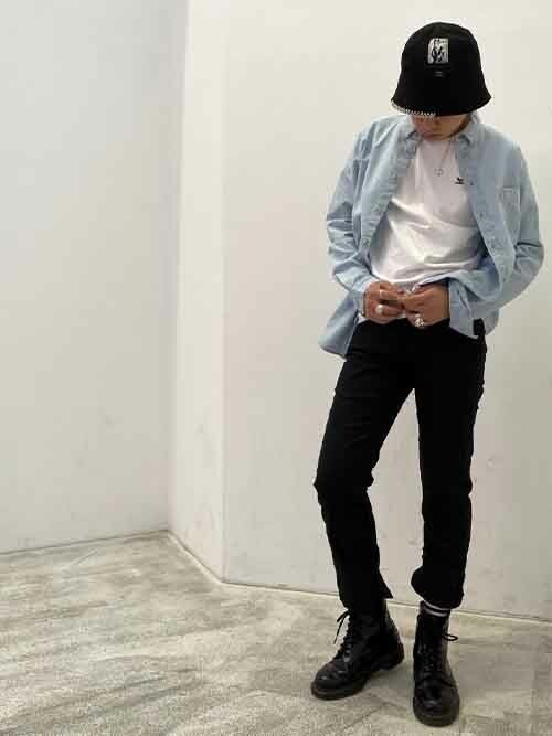 502の黒のチノパンツに、シャツ×Tシャツを合わせてシンプルに。足元に黒のショートブーツを合わせれば、脚長効果も抜群です。全体のシルエットがきれいに整っています。