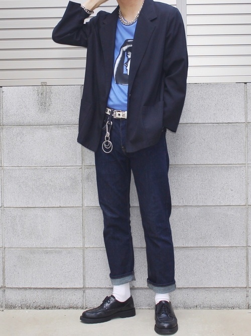 ブルーのプリントTシャツにライトジャケット、502デニムパンツを合わせています。インディゴブルーのデニムとジャケットが絶妙にマッチしています。足元は、ドレスシューズできれい目に、ロールアップで抜け感をプラスすれば、大人上品な印象の着こなしに仕上がりますね。