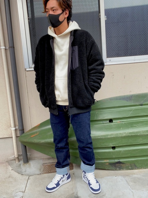こちらは、ボアジャケット×パーカー×502デニムパンツを合わせてトレンド感のある雰囲気に。足元はスニーカーを合わせて大人カジュアルスタイルにまとめています。