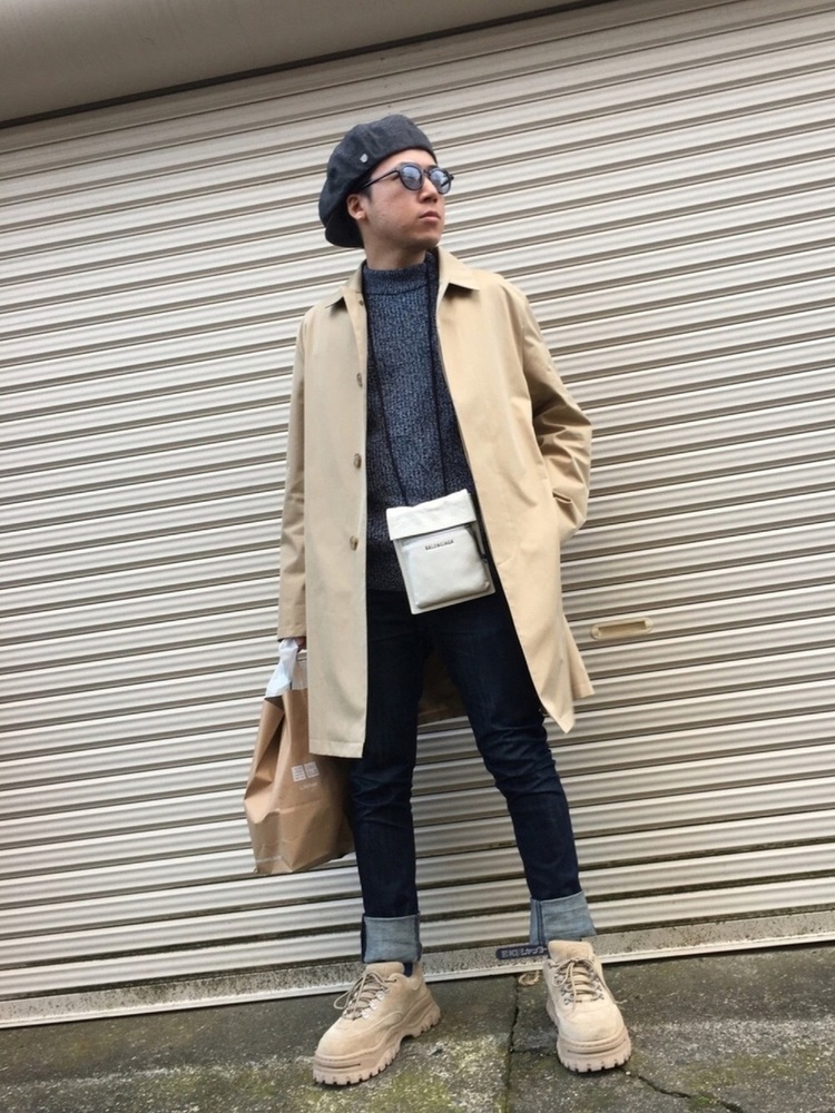 クラシカルなトレンチコートを、デニムでうまくカジュアルダウンさせたメンズコーデです。全体的にまとまりがあり落ち着いた雰囲気に見えるのは、それぞれのアイテムの色味を統一しているおかげ。インナーはニットにすることで、大人っぽい印象も確保しています。