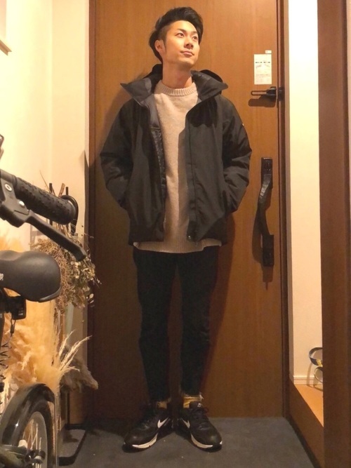 こちらはベージュのニットとテーパードパンツを組み合わせたトレンド感ある着こなしです。アウターとして羽織ったポールワーズのダウンパーカーのサイズ感もちょうど良く、女子ウケも良いでしょう。ニットとパンツがきれいめ路線なので、足下はスニーカーでハズして。街着にも軽めのアウトドアシーンにもぴったりのメンズコーデです。