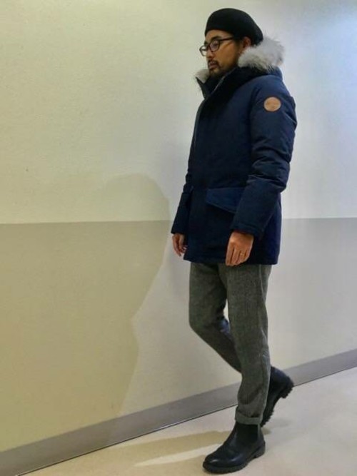 ダウンをジャストサイズで着用し、テーパードの効いたパンツと合わせたメンズコーデです。パンツとブーツの素材感が楽しい組み合わせでおしゃれを楽しんでいる雰囲気が伝わります。ポールワーズのダウンはボリュームがあるので、ボトムスはこちらのようにタイトめにするとバランスが良くなるでしょう。