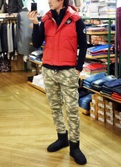 こちらはかなり本格仕様のポールワーズのダウンを着用しています。石井スポーツやゼビオでは夏の終わりあたりから本格的なダウンの取り扱いが開始。こちらのダウンは街着としては首元が重いせいで浮いてしまうかもしれませんが、アウトドアやレジャーシーンでは活躍するでしょう。デニムやテーパードパンツと合わせるとおしゃれです。