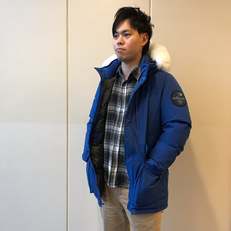 こちらは企画により、オーダーで作られたポールワーズのダウンを着用したメンズコーデです。ダウン自体がネイビーなので、シャツやデニムともカラーリンクを作って統一感を演出。メンズライクでかっこいい着こなしになっています。アウトドアシーンやレジャーシーンにもぴったりです。