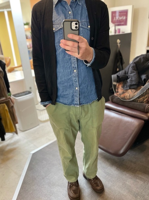 ガンホーカーゴパンツにデニムシャツ、カーディガンを合わせた落ち着いたメンズコーデです。革靴とブラックのカーディガンというきれいめスタイルですが、デニムシャツで外すところがおしゃれ。