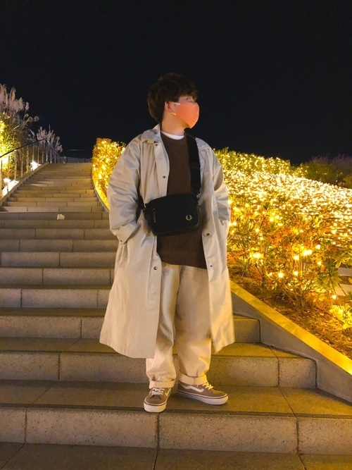 ベージュのロングコートにホワイト系のファティーグパンツを合わせた、明るい雰囲気のコーデ。アウター・パンツ・スニーカーとホワイト系が多いところに、濃い目のブラウンニットで引き締めました。