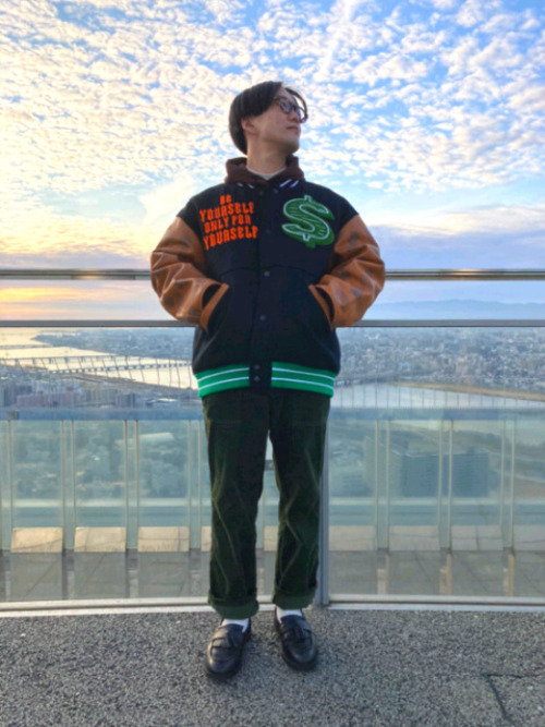 カラフルで個性が出るスタジャンに、コーデュロイのガンホーベイカーパンツを合わせた秋冬コーデです。パンツの裾を折り返してキュートにきめました。