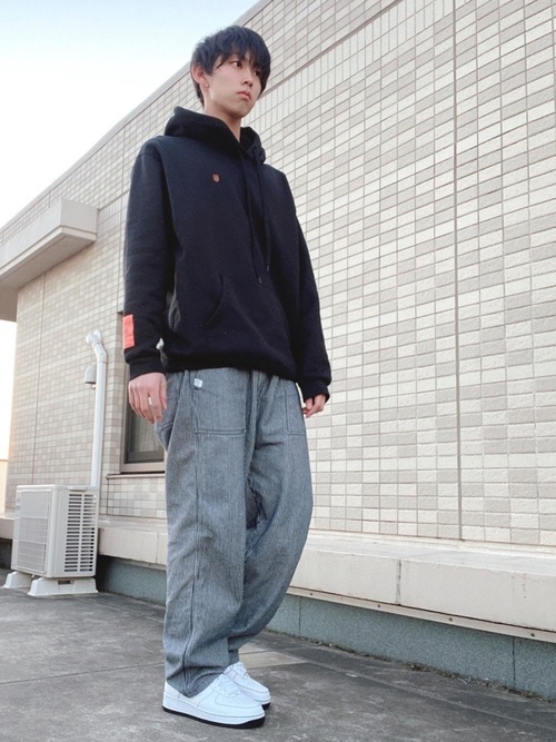 ゆるっとしたボリューム感あるイージーパンツにブラックのパーカーを合わせた、ストリート系スタイルです。大きすぎないサイズ感でラフ過ぎず、動きやすい普段使いにおすすめのコーデです。