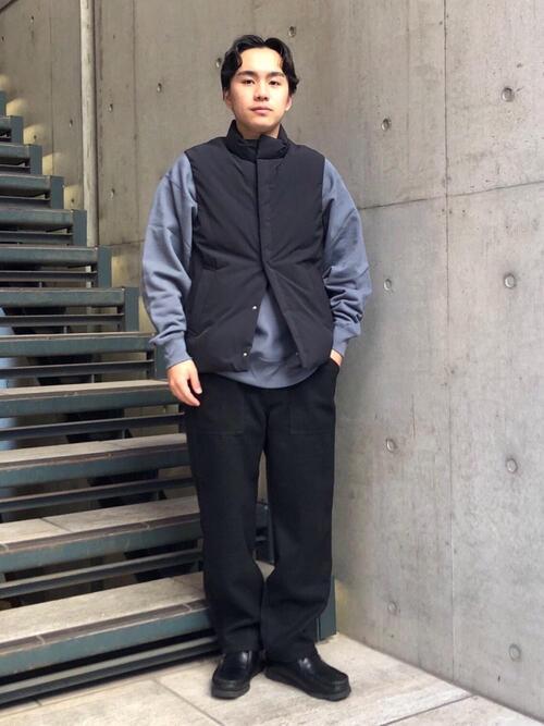個性的なブルーのスウェットに柔らかいホワイトのイージーシェフパンツ、ベストがおしゃれなコーディネートです。ギンガムチェックのスニーカーがポイント。ブラックのベストが全体を引き締めてくれます。