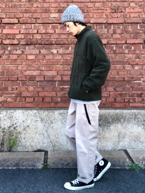 グリーンのもこもこボアブルゾンにベージュ系のガンホーのチノパン、スニーカーでカジュアルに着こなしました。ニットキャップがキュート、ベージュ系のチノパンが清潔感を感じます。