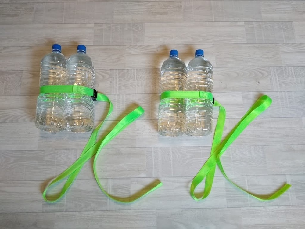 ②より重量を持たせたい時は、画像のようにペットボトルを4本まとめて固定する。