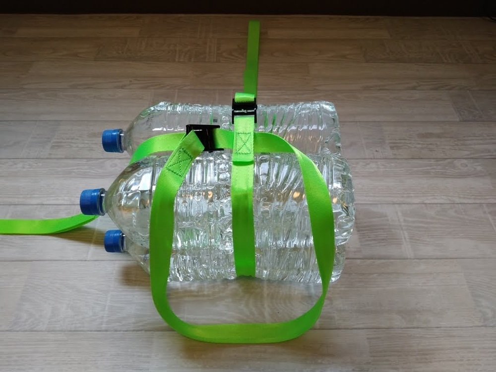 ①空のペットボトルに水を入れて、荷締ベルトでペットボトルを固定する。