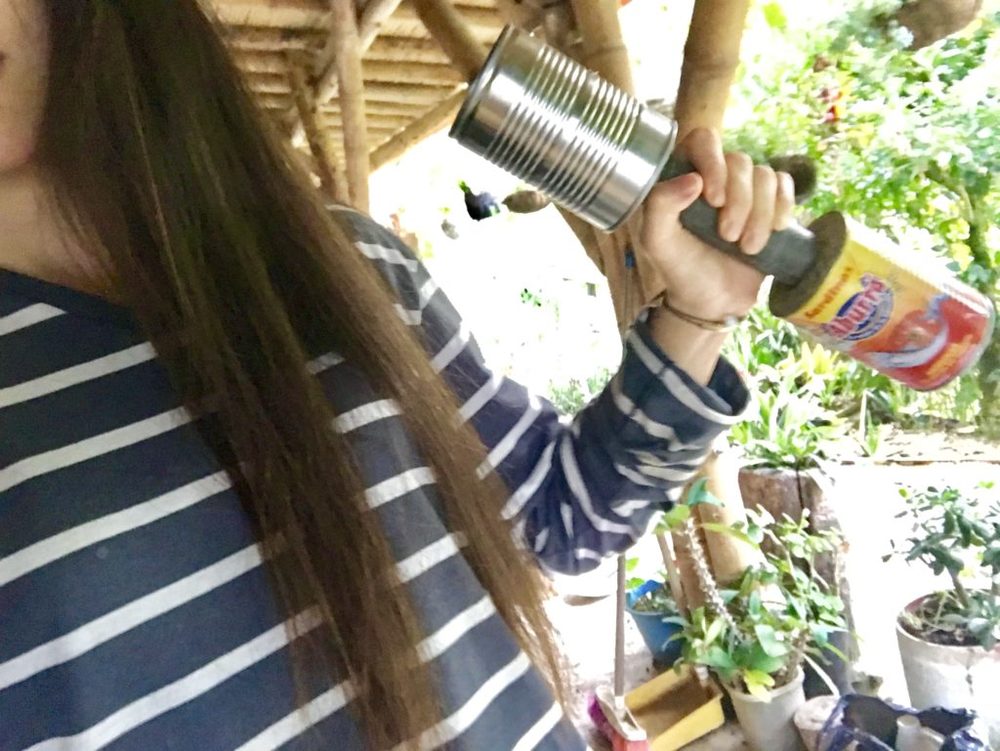 空き缶に練ったセメントを半分ほど入れて、ストッパー代わりに穴を開けて釘を刺した鉄棒を入れます。鉄棒を入れた状態ですり切りまでセメントを流し込んで乾かせば、ダンベルの片方は完成です。セメントの種類によって乾く時間には違いがあるので、購入したセメントの説明書きを確認しましょう。