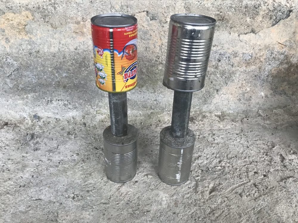 両方にセメントを流し込んでしっかり乾かせば、本格的なダンベルの完成です。こちらの写真のサイズで約3kgのダンベルです。重さは空き缶の大きさによって変わるので、自分の目的に合わせてサイズを変えましょう。空き缶部分を自分でデザインすればオシャレにアレンジも可能です。