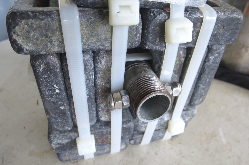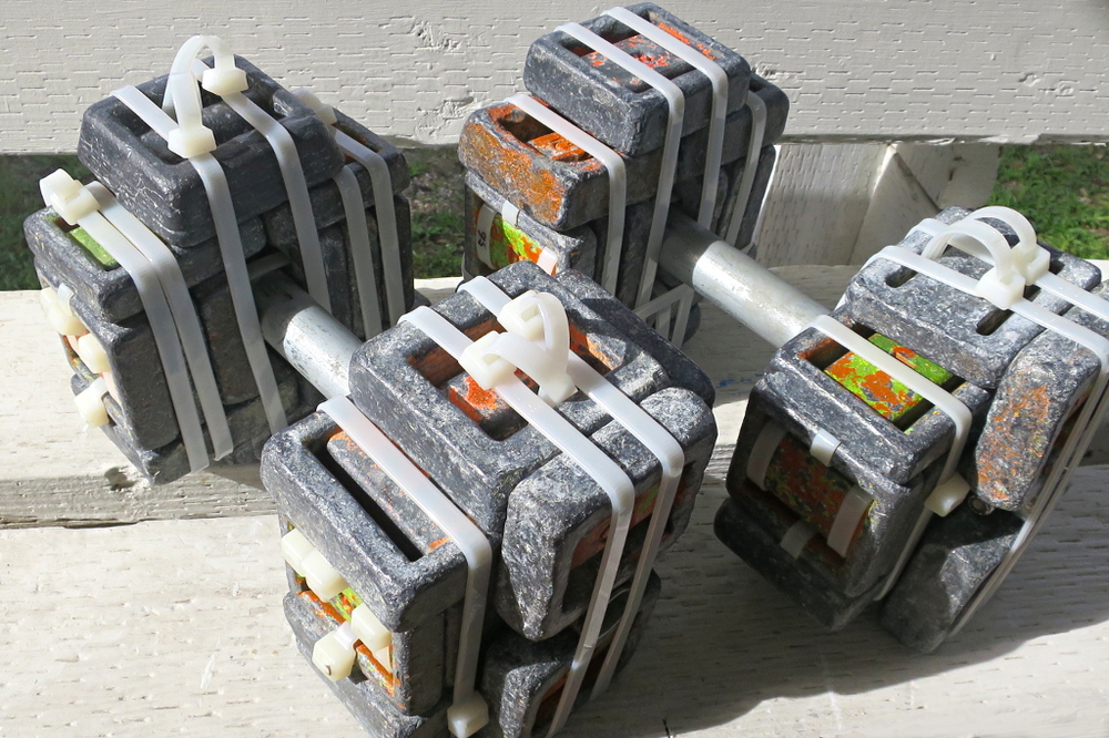 次に紹介するのはダイビング用の重りを使用したダンベルの作り方です。ダイビングの重りだけではなく他のものでも代用できる作り方なので、何かの重りがあるなら参考にしてください。今回使用する材料は重り、鉄パイプ、結束バンド、ロックナットです。重りと鉄パイプをダンベルの形に組み合わせて、ズレ防止のためにロックナットで固定します。