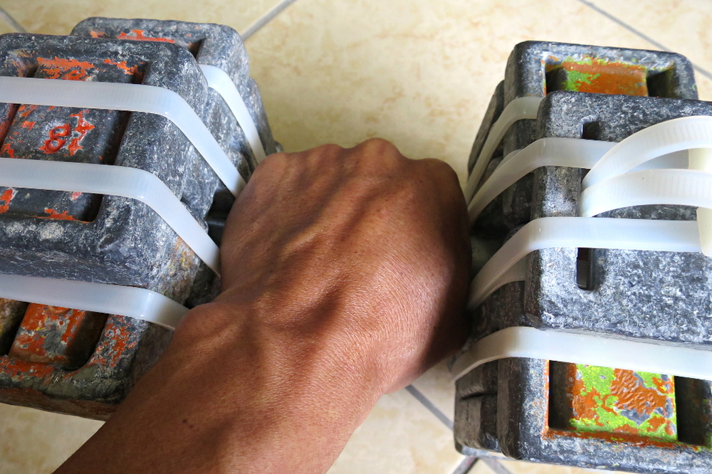 最初に自宅で簡単にできるペットボトルと荷物をまとめる時に使用する荷締ベルトを使用した、手作りダンベルの作り方を紹介します。低コストですぐに自作することができるので、思い立った時に作成が可能です。
