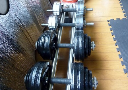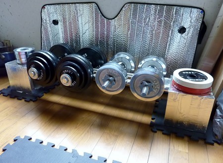 これだけの重りがあれば約27kgの高重量ダンベルを作成可能です。これほどの重さのものであれば市販のダンベルだと安くありませんが、自宅で手作りすればコストも抑えて自作できます。補助ラックと組み合わせれば様々な筋トレメニューを行うことが可能です。