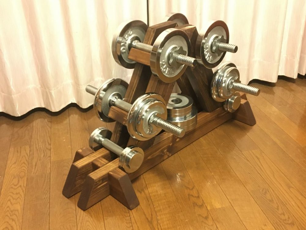 次に、手作りしたダンベルを置くためのラックやスタンドの作り方を紹介します。重いダンベルは床に置いておくと床がへこむ原因にもなりますので、ダンベルを置く時には床に直接置かないように注意しましょう。軽いダンベルでも長い間床に置くと跡が残ることがあります。