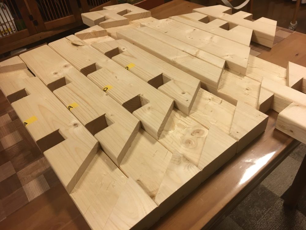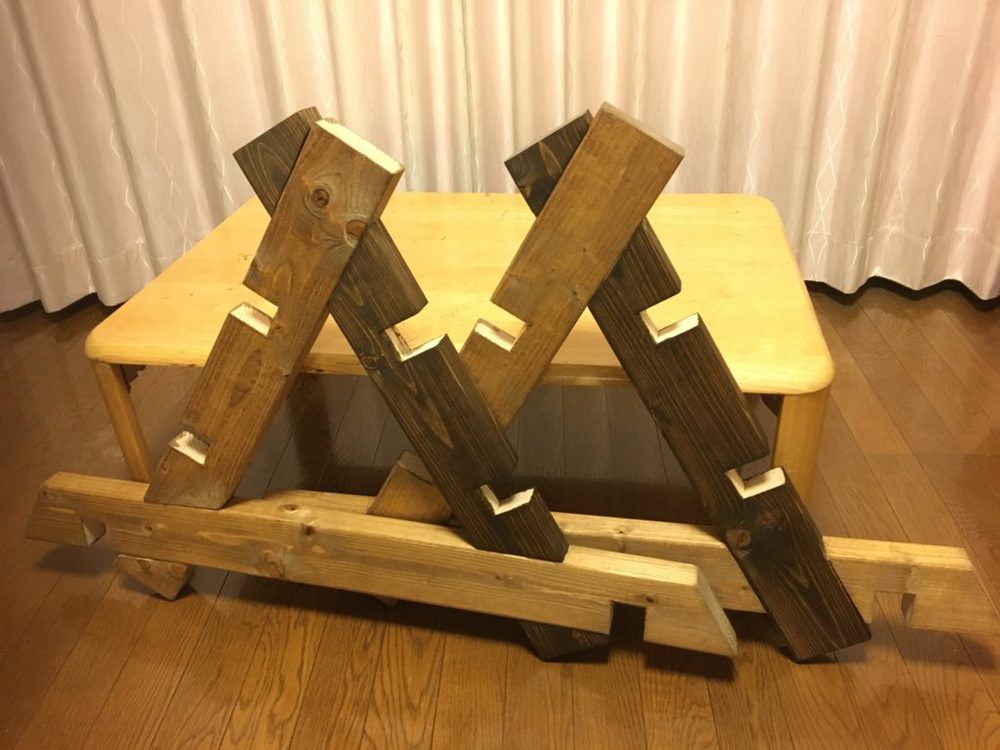 設計図を元にノコギリと鑿を使用して画像のように、組み木を作っていきます。工具の使用に慣れていないと時間はかかるかもしれませんが、使う工具が少ないのでDIYに慣れていない方でもコツを掴めば大丈夫です。組み木が完成したらあとは組み合わせと塗装を行います。