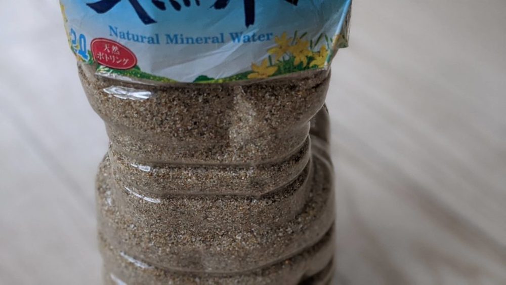 2リットルのペットボトルに砂を詰めれば、それだけで約3kgのダンベルを自作することができます。ペットボトルの形状は真ん中がへこんでいるものが多いので、握りやすくそのままでもダンベルとして十分使えます。先程のベルトやグッズと組み合わせればもっと高重量のダンベルを作成可能です。