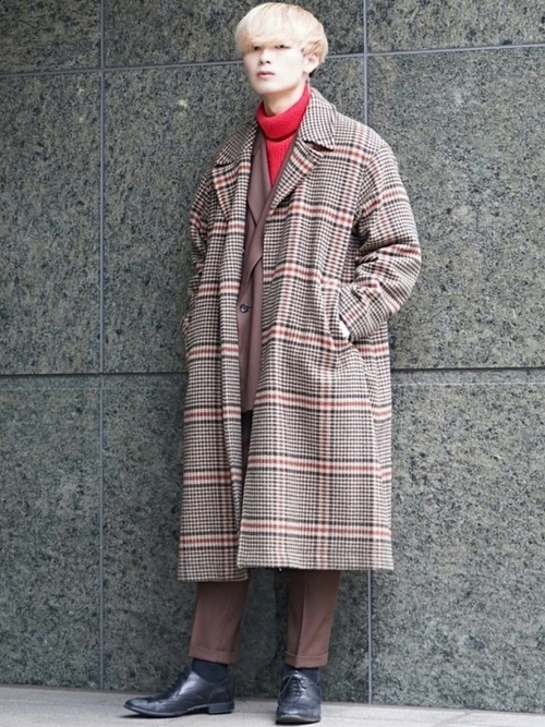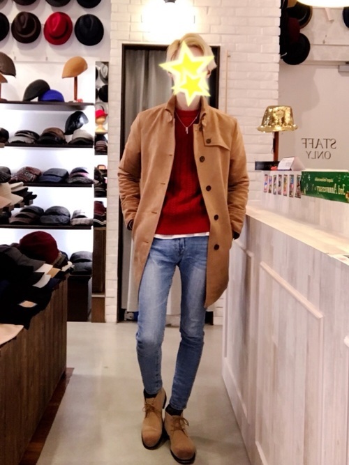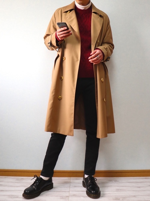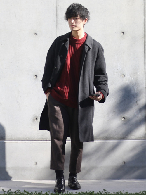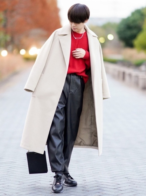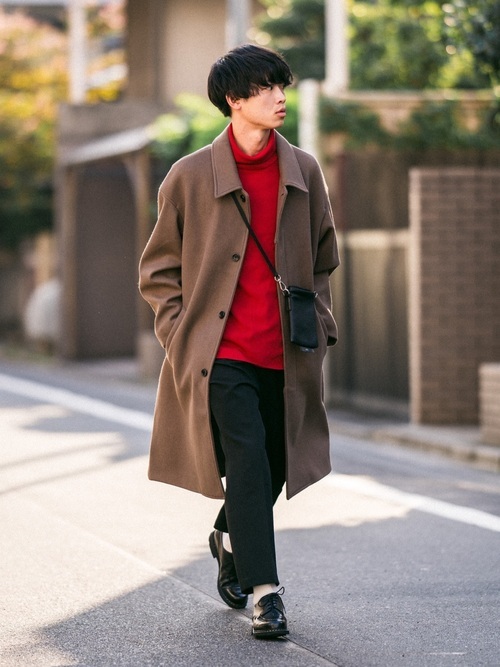 ブラウン×ブラックのダークトーンカラーで、インナーの赤ニットを引き立たせた定番の着こなし。存在感の強いビビッドな赤ニットですが、ステンカラーコートを羽織っているので露出面積が抑えられ、主張しすぎずにアクセントを効かせられます。