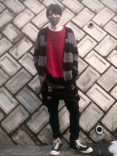 赤ニットにサロペットとボーダー柄のカーディガンを合わせた個性派コーディネート。ワインレッドの大人な赤ニットを使用して、ブラック×グレーでモードな雰囲気に着こなしています。