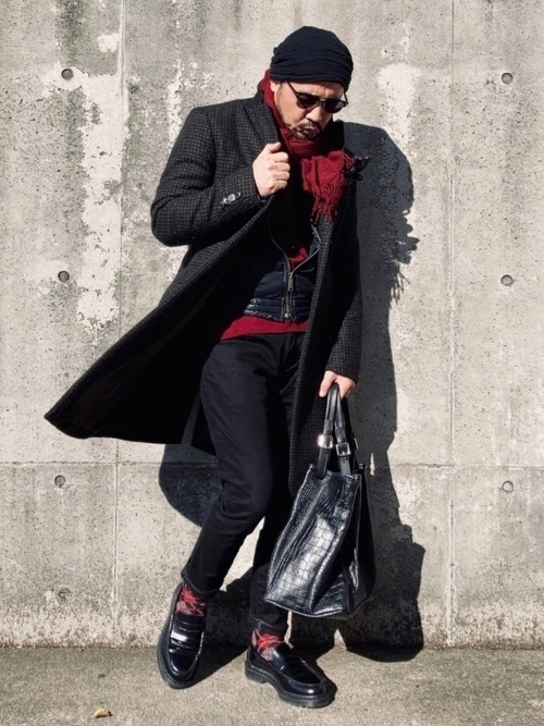 ワインレッド×ブラックのムーディーな色使いで、外国人風のエレガントなスタイルにキメたおしゃれなメンズコーデです。赤ニットと同じワインレッドのマフラーとソックスを取り入れることで、黒特有の重苦しさが軽減され、バランスのよいカラーリングになります。