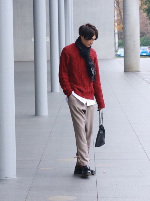 クルーネックの赤ニットセーターに、ゆったりサイズのスラックスを合わせたカジュアルコーデ。のっぺりとした印象を避けるため、インナーにシャツを着てレイヤードスタイルでメリハリをつけるのがポイントです。首元にマフラーを巻いて、しっかりと季節感も出しています。