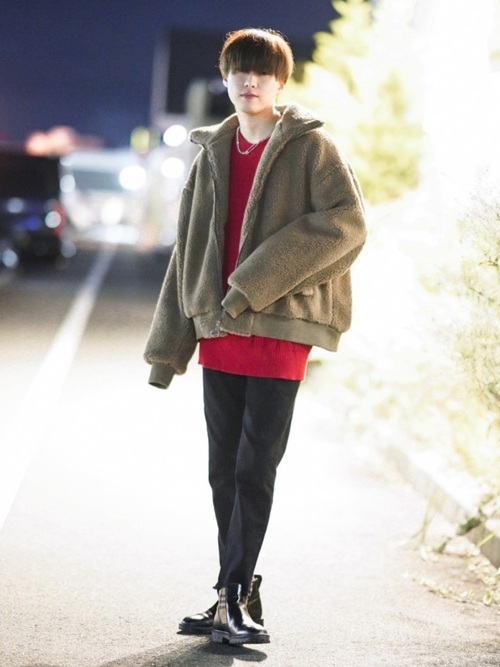 GUのローゲージ赤ニットにボアブルゾンをアウターに羽織ったきれいめのカジュアルコーデ。ブラウン×ブラックの色使いで、赤ニットを引き立たせているのがポイントです。トレンドに合わせてアウターをビッグシルエットにすることで今風を演出できます。