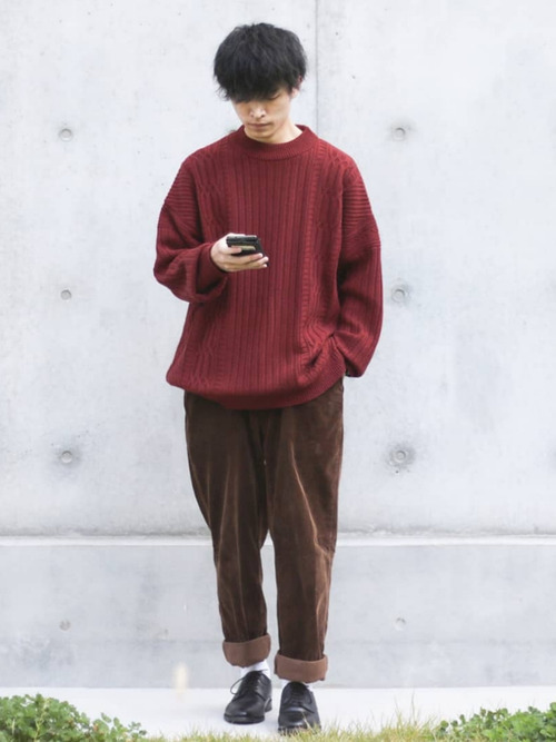 えんじ色の大人な赤ニットにはブラウンカラーがよく似合います。ブラウン×コーデュロイの組み合わせで秋らしさ満点の着こなしに。足下をロールアップさせてドレスシューズをあてれば、カジュアルすぎず引き締まったコーディネートに仕上がります。