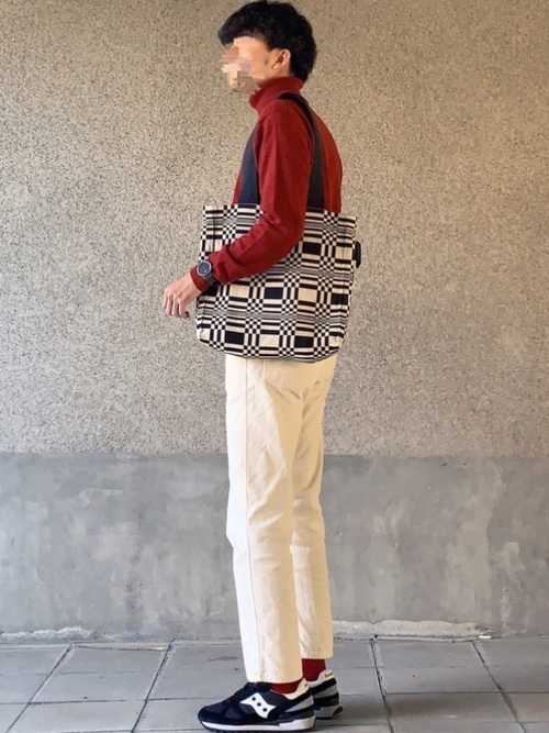 ユニクロのカシミヤタートルネックセーターを使った赤ニットメンズコーデです。赤ニットを全面に出したコーディネートなので、落ち着いた色味のえんじ色で大人っぽさを演出。ホワイトのデニムパンツで明るさを出し、春らしい着こなしに仕上げています。