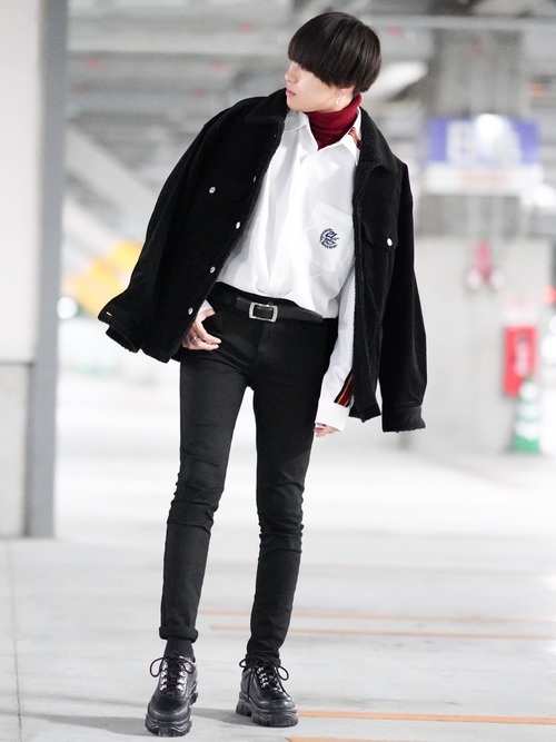 ユニクロの赤ニットにシャツを合わせて、襟元からタートルネックを覗かせた技ありのメンズコーデ。えんじ色のきれいな赤ニットがアクセントになっています。アウター・パンツ・シューズを黒でまとめて、白シャツと赤ニットを強調させるのがポイントです。