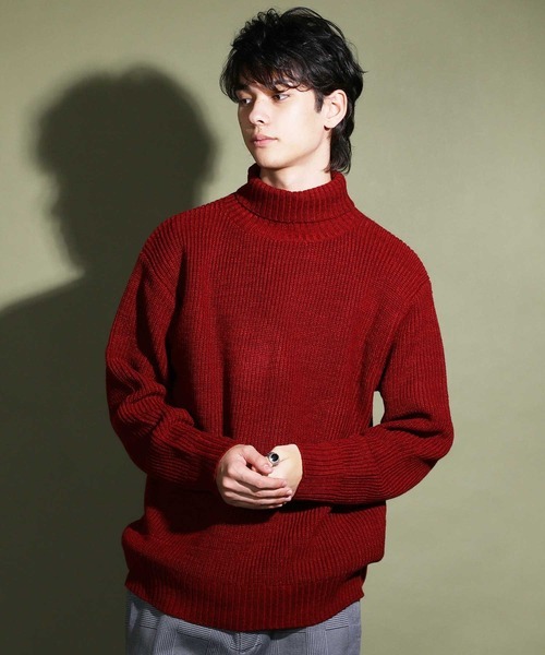アラン編みのタートルネックケーブルニットセーターです。立体的な編み込みがおしゃれなワインレッドの赤ニットなので、シンプルなコーディネートで映える1枚。トレンドのビッグシルエットを取り入れたオーバーサイズのため、アウターとしてゆったりと着こなすことも可能です。