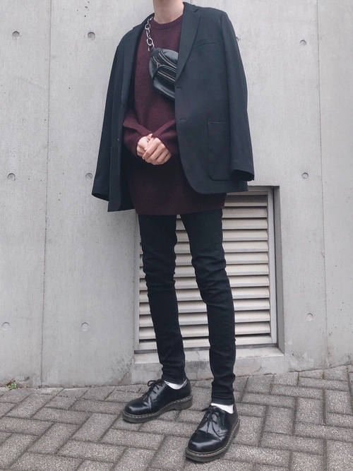 ボルドーカラーの渋い赤ニットは、色味の近い黒を基調としたコーディネートでまとめるのがおすすめです。ハイゲージの薄手ニットは、ジャケットと細身のスキニーでドレッシーにまとめると女子ウケのよい着こなしです。艶のあるドレスシューズを合わせて上品なコーデに仕上がっています。