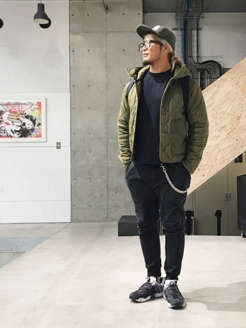 黒×黒の重く見えがちなコーデに、オークリーの白いTシャツをチラ見せして軽さを出す技ありメンズコーデに仕上げています。足元は白のスニーカーで清潔感もあります。