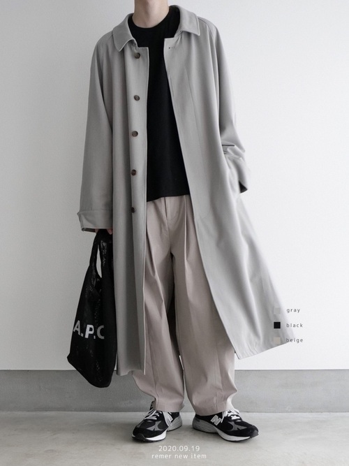 オーラリーのシームレスクルーネックハーフスリーブTシャツの上にステンカラーコート、ゆったりとしたパンツを合わせたおしゃれメンズコーデです。