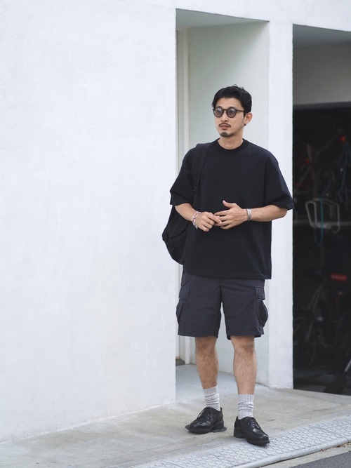 オーラリーの黒いTシャツとカーゴショーツをコーデしたメンズファッションです。オーラリーのTシャツはシルエットがきれいなので、ラフになりすぎません。また、足元をローファーにして大人の遊び心あるコーデになっています。