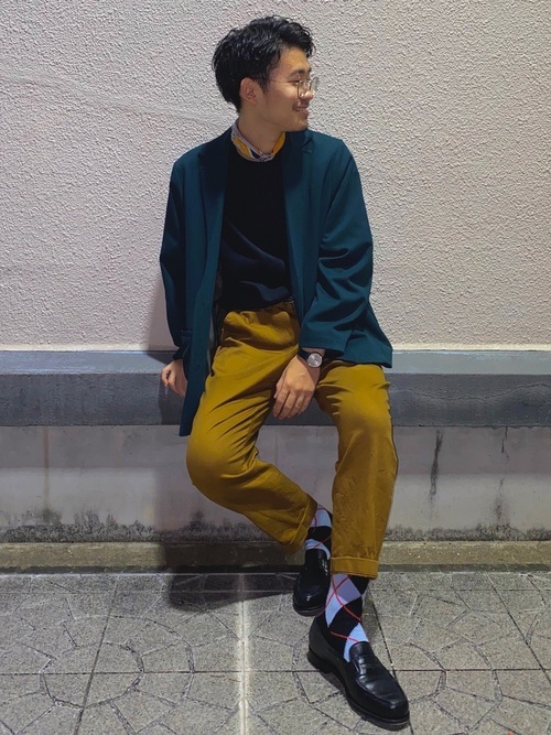 オーラリーの黒いTシャツに、首元にスカーフを巻いたおしゃれなメンズコーデです。上品な柄の靴下、ローファーで合わせ細部にまでこだわった全身きれいめファッションでまとめています。
