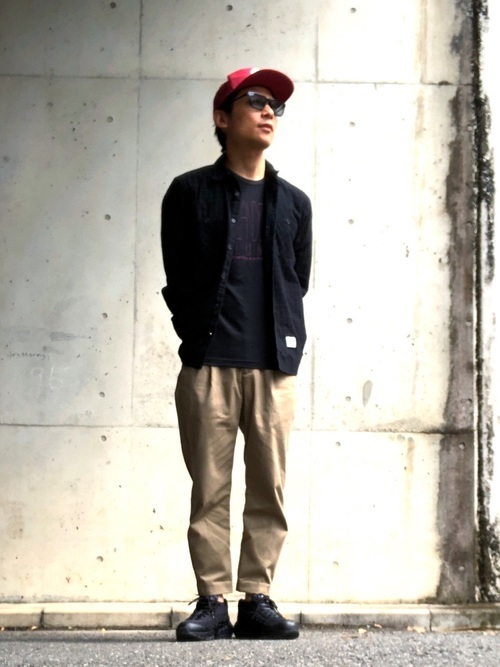 コロンビアの黒のTシャツに黒のシャツを合わせたコーディネート。パンツはベージュ系で抑え、カジュアルながらも、きちんと感のある着こなしです。