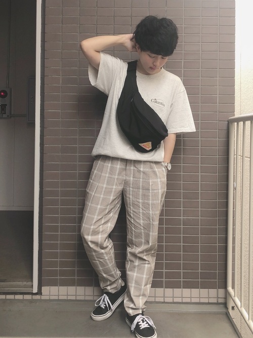 ブラウンカラーのコロンビアのTシャツを使ったコーディネートです。Tシャツがシンプルなので、チェック柄のパンツのおしゃれさが際立っています。