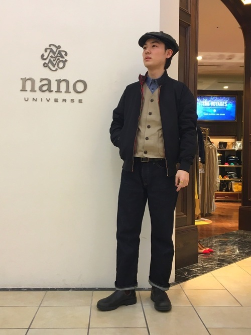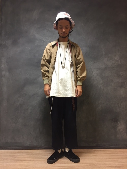 トップスはバラクータのスイングトップを上手に使ってIラインを強調したメンズコーデです。ボトムスは太目のバギーパンツで緩めのシルエットを実現しました。ハットを足すことで程よいバランスを保っています。