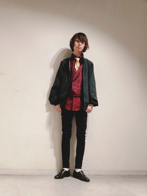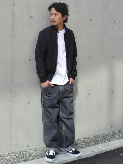 こちらは全身を古着をの服で組み合わせたメンズコーデです。ブルゾンをはじめとし、全体的に黒のアイテムを多用しているためシックな雰囲気に仕上がっています。