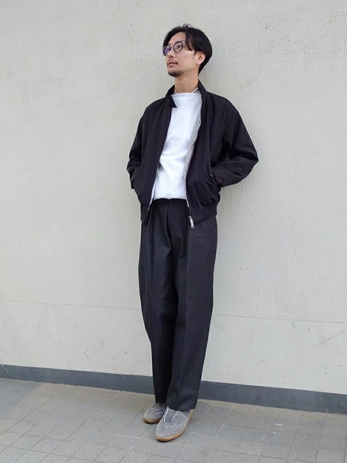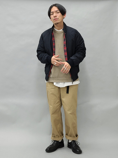 ベージュ×ブラックの服コーデはトレンドです。こちらは膨張しがちなベージュのアイテムをバラクータのスイングトップやシューズ、ベルトで上手に抑えたメンズコーデになっています。