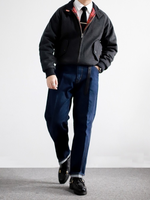 バラクータのスイングトップをアメカジ風に着こなしたいならボトムスはデニムがおすすめです。流行のテーパードシルエットよりはストレートのものをセレクトすると英国風におしゃれにまとまります。
