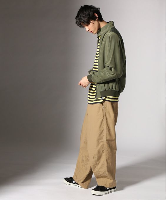 スイングトップと太めのパンツを合わせたメンズコーデが人気です。カラーを調整してきれいなスタイルになるように服の色味を構成するのがポイントになります。