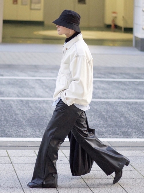 ホワイトとブラックのカラーで全体をまとめたこちらのコーデ。ショート丈ののアウターのレザーのフレアパンツでバランスがよく取れています。マルジェラの足袋ブーツで足元にアクセントをだし、シンプルながらも遊びゴコロが感じられるメンズコーデです。