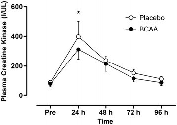 Placeboは、条件を同じにするために、BCAAが含まれない効果のない液体を飲んだグループのグラフです。BCAAを飲んだグループの方がクレアチンキナーゼの血中濃度が下がっているのがわかります。