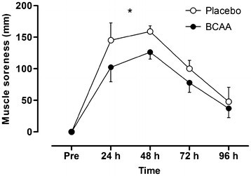 この論文ではBCAAを摂取するグループと、摂取しないグループに分け、筋肉が損傷するような様々な運動をさせた後、すぐにBCAA(または何もはいっていない液体)をすぐに摂取させたところ、BCAAを摂取したグループの方が、摂取しないグループより筋肉が早く回復することが分かりました。