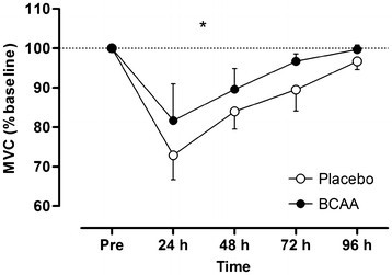 最大随意収縮も回復しました。随意収縮とは、腕などに力を入れた時に起こる筋肉の収縮のことです。これを計測することで力の回復を測定したところ、BCAAグループの方が明らかに回復しています。