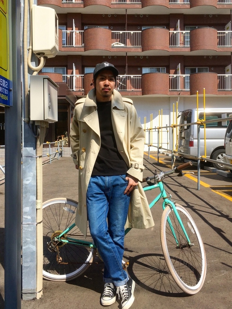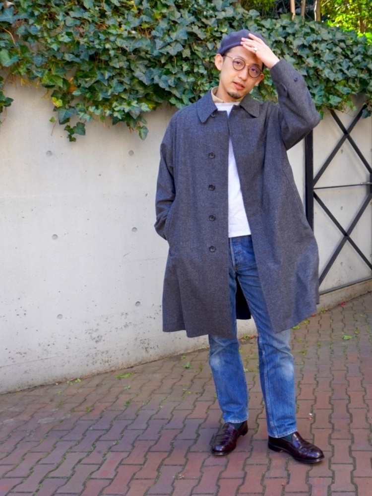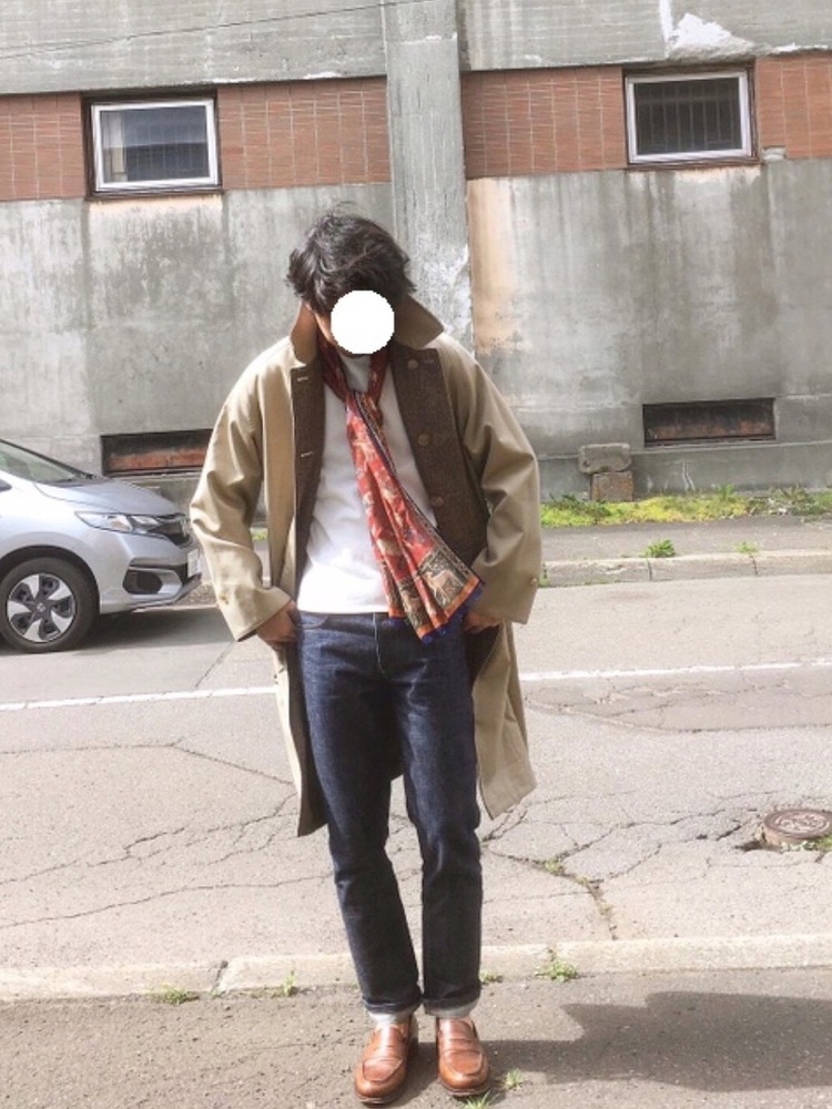 セントジェームスの白のカットソーにアナトミカのバルカラーコートを羽織ったフレンチカジュアルコーデ。無地カットソーのインナーにシャツを着ることで、品のよさと落ち着きが増しています。程よく色落ちしたリーバイスのジーンズとローファーで、抜け感のあるカジュアルコーデに仕上がっています。